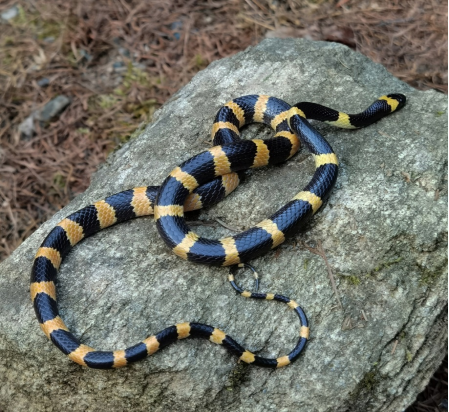 截至2022年我省蛇类有效记录共4科22属39种。本次发现的刘氏链蛇为雌性亚成体,全长486 mm,背面黑色、黄色相间,腹面黑色、白色相间,黑黄相间环纹向腹部延伸至腹面。据刘晓东、马瑞林和李晓鸿老师介绍,刘氏链蛇是2011年发表的蛇类新种,根据现有记录主要分布于四川省、陕西省、浙江省、广东省、河南省、湖南省、山西省、北京市、河北省和安徽省。在甘肃省是首次发现,刘氏链蛇在甘肃的发现将其地理分布范围向西北延伸约200公里,为该类物种的动物地理学研究提供基础资料。